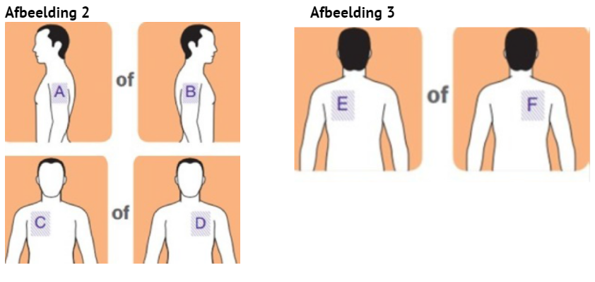 Ook kunt u de pleister op de huid van de bovenarm, borst (niet op de borsten zelf) en bovenrug plakken, zie afbeelding 2 en 3.
